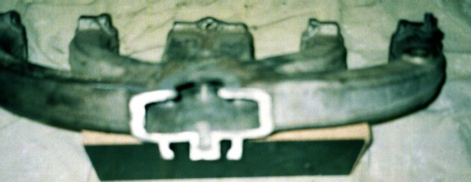 ![]() 1.4 Finished manifold: bottom view. The exhuast mating surface has been reattached. The holed are now threaded as well with 7/16" UNC for new bolts from the exhaust manifold to attach to. |