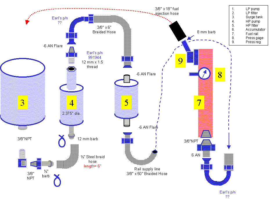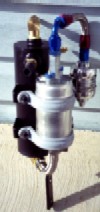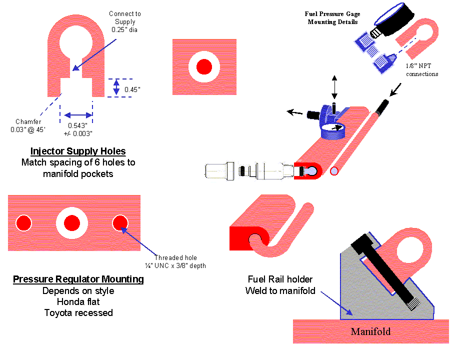 everything up and simply lowers performance. Therfore, I wanted to switch from a carb based induction system (which tries to control mixture mechanically which has difficulty handling a great amount of variability) to programable fuel injection which uses sensors and a computer chip to adust the ratio dynamically as conditions change. Since I was also intending to add boost, I wanted programable timing to be able to easily retard the timing at higher boosts. For this I looked to Racetech and their SDS (Simple Digital System) 6F system. I would however, have to create a custom manifold to hold the injectors and the fuel rail as well as accept the compressed, cooled air from the supercharger. A high pressure fuel system is a must and sensors have to be mounted in their appropriate locations. |