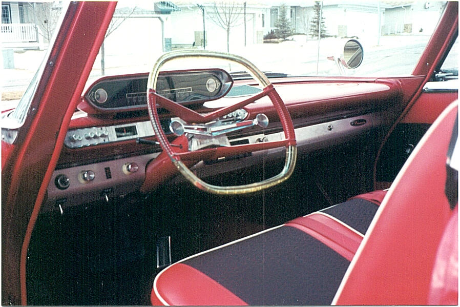 "Square" steering wheel, 3 speed push button torqueflite tranny, remote control drivers mirror, seatbelts, cable accelerator pedal, electric windshield washers, rear deck blower/defroster