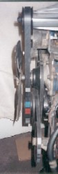 ducts, throttle body, blower, intercooler, etc) and this was my starting point. Building sequence. I had to build a bracket to support the blower and engineer the drive system at the same time. I blocked the blower in what I thought was the best approximate location and began measuring, sketching and scratching my head. Once I had worked out approximate location, I had to detemine what I would use for a crank drive pulley, how I would fasten it and its exact position. After seaching for an TBird SC 8 groove pulley (which are rare, therefore expensive), I realized that I could do what GM did with their blowers and use a 6 groove pulley which are plentiful (read cheap)! I've settled on Ford's 7 1/2" dia. (p/n: E8DE-6312-AA) which I pulled off an 89 FWD Linclon with the 3.8 L. |