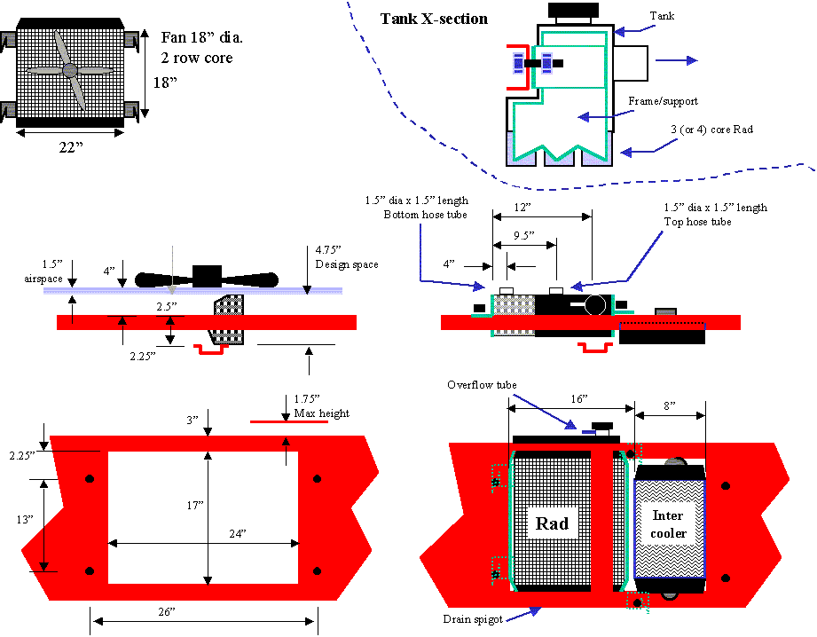INTERCOOLER & TUBES How to get it to fit?? I sketched and tried and planned for a highly customized rad but so far, I've not needed it. I'm using a 2 core rad from a 77 Aspen wagon with no A/C. |